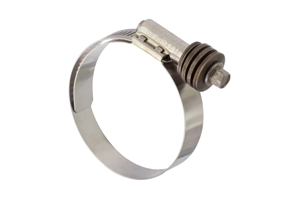 The band clamp with worm drive and integrated spring system is designed to deliver reliable, long-lasting sealing performance even under demanding conditions. Its innovative spring mechanism, composed of eight disc springs positioned beneath the screw head, automatically compensates for dimensional changes caused by hose shrinkage or extreme temperature fluctuations. This ensures consistent pressure and tightness around the entire circumference of the hose, effectively preventing leaks and maintaining system integrity. The internal insert provides additional protection by safeguarding the hose surface from potential damage, while the stainless steel 300 band and galvanized carbon steel screw and lock guarantee durability and resistance to corrosion. With a 14.3 mm (9/16″) band width and an installation torque of 5.6 Nm (maximum 9.6 Nm), the clamp is engineered for secure and precise assembly. The correct installation is easily verified by the visible protrusion of the screw end beyond the lock housing and the flattened disc springs. This advanced clamp is particularly recommended for applications exposed to significant temperature variations, offering a dependable, maintenance-free solution that enhances both safety and efficiency in fluid systems.