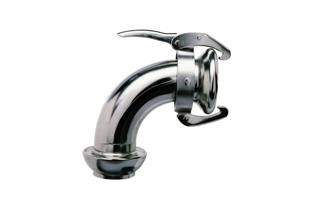 The 90° connector for LAUX lever coupling 42 socket-plug is a highly versatile solution designed for demanding industrial and agricultural applications. Engineered from durable galvanized carbon steel, it ensures long-lasting performance even in challenging environments. Its robust construction allows safe and efficient transport and unloading of bulk materials such as grains, flour, feed, granules, cement, and minerals, while also supporting pressure and vacuum pumps. The connector is equally effective in building temporary water and air installations across construction sites, mining operations, and agricultural facilities, as well as in irrigation systems. With a maximum working pressure of 12.5 bar for liquids and 8 bar for air, combined with vacuum tightness, it guarantees reliability under intensive use. The standard EPDM gasket provides excellent sealing, though for media other than water, careful selection of gasket material is recommended to ensure compatibility and safety. Designed to operate in extreme conditions, the connector withstands temperatures ranging from -50°C to +120°C, making it an ideal choice for professionals seeking efficiency, durability, and flexibility in fluid and material handling systems.