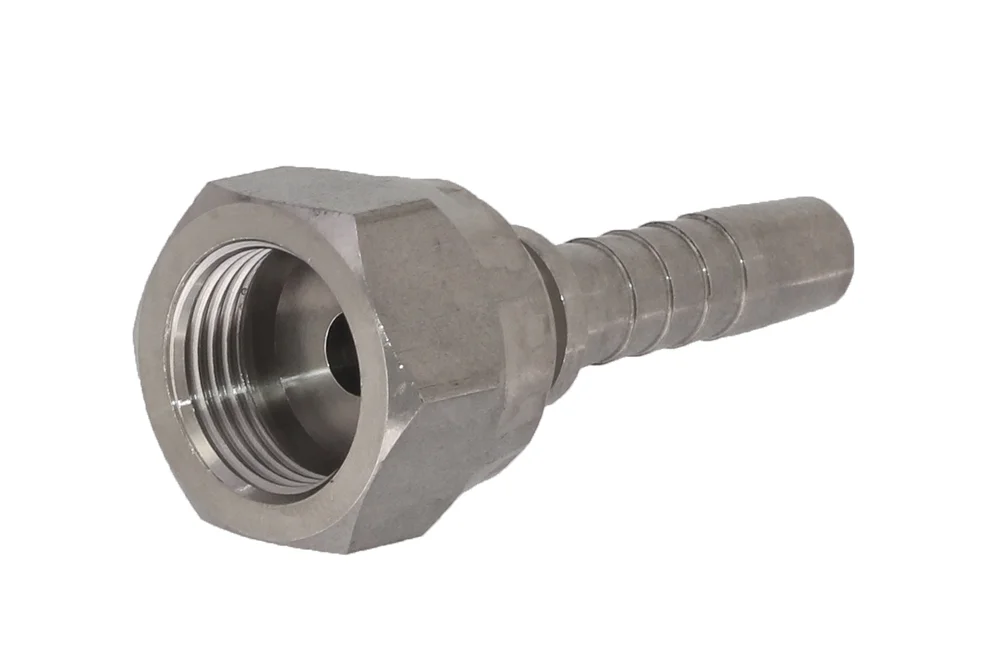 The standard hydraulic end fitting, type Z, is designed with a classic hydraulic tail for secure hose connection and features an internal BSP thread with nut, ensuring reliable assembly in demanding applications. Its flat sealing system requires the use of an additional DKR-F flat gasket, providing enhanced tightness and safety in operation. Engineered for crimping with hydraulic and industrial hoses, it is compatible with crimping sleeves tailored to the specific hose type, guaranteeing durability and precision in performance. Manufactured from premium AISI 316L stainless steel, the fitting offers outstanding resistance to corrosion, making it ideal for use in harsh environments and ensuring long-lasting reliability. This robust construction, combined with its versatile design, makes it a trusted solution for a wide range of hydraulic and industrial systems where efficiency, safety, and durability are essential.