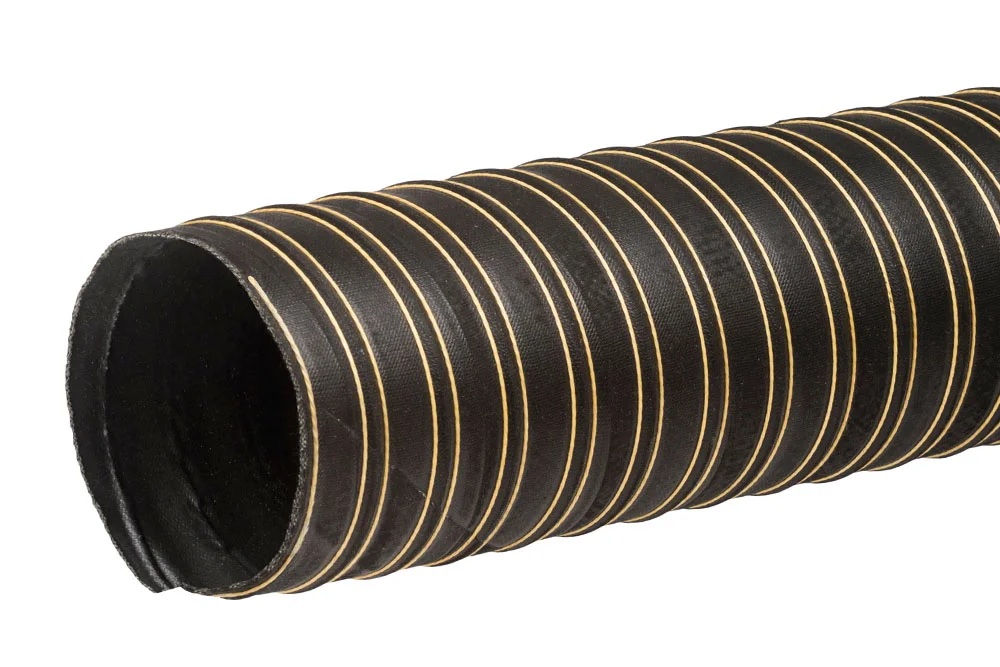 This lightweight yet highly durable hose is engineered for maximum flexibility and elasticity, making it the ideal solution for extracting hot vapors, smoke, gases, and for efficient air blowing or cooling applications. Built as a reinforced version of the NEOPRENE 1 model, it features two layers of glass fabric impregnated with premium black CR rubber (Neoprene®) and a robust steel spiral reinforcement placed between the layers, ensuring excellent resistance to chemicals, UV radiation, and aging. Its smooth interior surface in a straightened state guarantees optimal airflow, while the small bending radius allows effortless installation even in confined spaces of industrial equipment or vehicles. Perfectly suited for demanding environments, it is widely used in plastic processing for hot air in granulate dryers and film blowers, in paint dryers within printing houses, in various industrial and electronic drying systems, as well as in vehicles, engines, incinerators, and for the safe extraction of exhaust and welding gases. Designed for reliability and versatility, the hose operates within a wide temperature range from -35°C to +135°C, withstanding peaks up to +150°C. Easy to mount with clamps, it is also available in customized diameters, lengths, and with soft ends on request, offering tailored solutions for specialized industrial needs.
