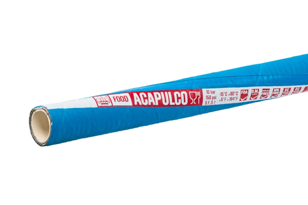 This highly durable suction and discharge hose is engineered for the safe and efficient transfer of food products, particularly oils and fats, ensuring maximum hygiene thanks to its odorless and tasteless rubber composition free from phthalates and bisphenol A. Built with a white NBR/PVC inner layer that fully complies with FDA 21 CFR 177.2600 and D.M. 21/03/73, it guarantees safety in direct food contact, while meeting the strict requirements of EU regulations 1935/2004/EC and 2023/2006/EC (GMP). Reinforced with two layers of synthetic cord and a robust steel spiral, the hose offers exceptional strength and flexibility, making it ideal for demanding industrial applications. Its smooth blue CR rubber outer layer is resistant to grease, abrasion, and aging, ensuring long-lasting performance even under intensive use. With a working pressure of 10 bar, a vacuum rating of 0.9 bar, and an operating temperature range from -15°C to +90°C, this hose delivers reliability and safety in every process. Perfectly suited for the oil and fat industry, it combines durability, compliance, and efficiency, making it a trusted solution for professionals who value uncompromising quality.
