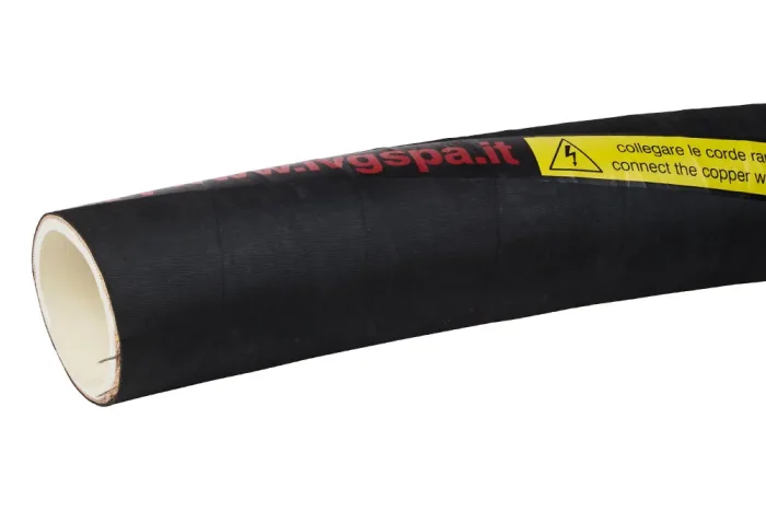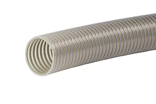 This high-performance suction hose is engineered for pneumatic transport of dry, abrasive materials, ensuring durability, safety, and compliance with the strictest food industry standards. Its smooth, white inner layer made of abrasion-resistant NR/SBR rubber guarantees minimal wear (≤110±5 mm³ according to ISO 4649) while remaining phthalate-free, food-grade, and fully compliant with FDA 21 CFR 177.2600 and BfR XXI category 4, making it ideal for direct contact with dry food products. Reinforced with a robust synthetic cord and equipped with two integrated copper wires to safely dissipate static electricity when grounded, the hose provides reliable protection during intensive operations. The outer layer, crafted from black EPDM rubber, is electrically conductive and resistant to ozone and weather conditions, ensuring long-lasting performance even in demanding environments. Perfect for transporting grains, sugar, powders, feeds, granules, or PVC pellets requiring a non-staining inner surface, this hose is available in two versions: BN Standard with 6 bar working pressure and BN Special with 8 bar. Offered in standard lengths of 60 m (with 120 m available on request), it operates efficiently in a wide temperature range from -30°C to +70°C, delivering a versatile and dependable solution for industries seeking maximum hygiene, safety, and resistance in pneumatic conveying systems.
