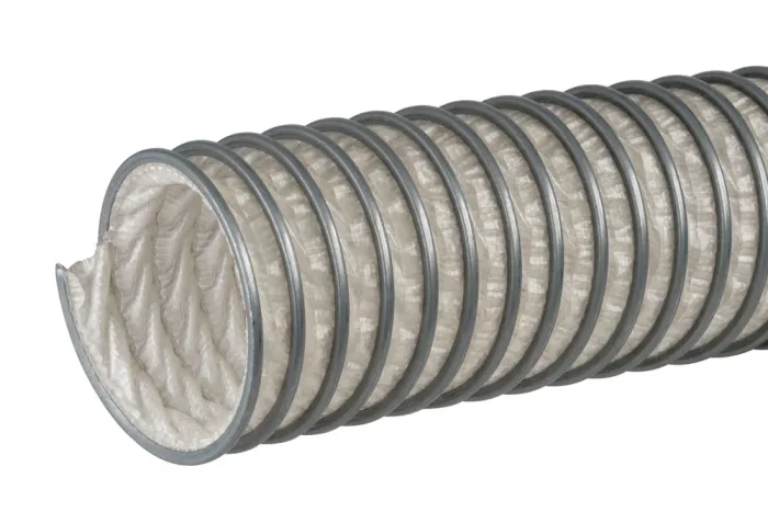 This lightweight and exceptionally flexible hose is engineered for the safe discharge of aggressive chemical vapors, gases, dust, and fibers, making it an ideal solution for demanding applications in the chemical industry, including asbestos removal. Manufactured from durable polyethylene fabric coated with PE and reinforced with a robust external galvanized steel spiral, it offers outstanding resistance to solvents, hydrolysis, and biological corrosion, while remaining free from halogen compounds and plasticizers. Its high compressibility ratio of up to 1:8 ensures convenient handling and space-saving storage, while the strong spiral construction guarantees excellent impact resistance. For larger diameters from 80 mm, the hose is also available with a stainless steel spiral, further enhancing durability in harsh environments. Designed for easy installation with bridge clamps (left-handed), it is supplied in standard lengths from 2 to 10 meters and operates reliably within a wide temperature range from -40°C to +80°C. With its superior chemical resistance and proven performance, this hose delivers maximum safety, efficiency, and reliability in the most challenging industrial conditions.