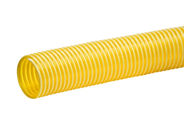 This lightweight and highly flexible suction and discharge hose is designed for safe transfer of water, juices, soft drinks, beer, wine, alcohols up to 20%, and a wide range of other food products, while its transparent yellowish PVC wall allows continuous visual flow control. Reinforced with a durable hard PVC spiral, it offers excellent resistance to impacts, vacuum, and hose collapse, ensuring reliability in demanding conditions. The smooth inner surface minimizes flow losses and facilitates easy cleaning, while the slightly corrugated exterior enhances flexibility and handling. Certified for food contact in accordance with European regulations 1935/2004/EC, 10/2011/EU, and 2023/2006/EC (GMP), it guarantees safety and compliance in food industry applications. Beyond food use, it is also suitable for industrial, construction, and agricultural environments, where it can handle light chemicals, water, sludges, sewage, air, dust, powders, granules, and other non-fatty bulk materials. For operations where electrostatic discharge may pose a risk, the special antistatic version LUISIANA AS, equipped with an embedded copper wire for grounding, provides additional protection and reliability. With working pressures ranging from 2 to 8 bar depending on diameter and an operating temperature range of -5°C to +60°C, this hose combines versatility, safety, and durability, making it an excellent choice for both food-grade and technical applications.
