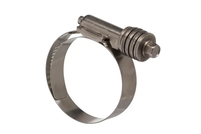The band clamp with worm drive and integrated spring system is designed to deliver reliable, long-lasting sealing performance even under demanding conditions. Its innovative construction, featuring a set of 10 disc springs beneath the screw head, ensures constant tension and automatic adjustment of the clamp’s diameter to compensate for hose shrinkage or expansion caused by temperature fluctuations or material cold flow. This guarantees a secure, leak-free connection around the entire hose circumference, making it an excellent choice for heavy-duty applications exposed to significant thermal variations. The internal insert safeguards the hose surface from damage, while the clear visual indicators—flattened disc springs and the screw end extending beyond the lock housing—confirm proper installation. With a tightening torque of 8.5 Nm (maximum 14.1 Nm), a robust galvanized carbon steel screw and lock, and a durable stainless steel 300 band with a 16 mm (5/8”) width, this clamp combines strength, flexibility, and reliability. It is the ideal solution for professionals seeking superior performance, durability, and peace of mind in critical installations.
