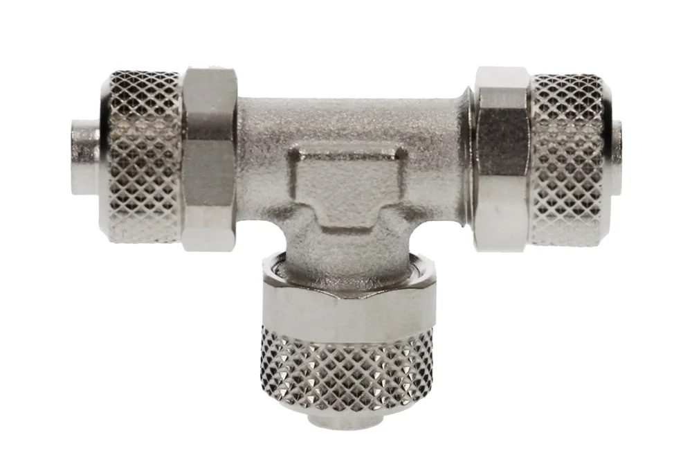 The Type C9 tee fitting is a reliable solution for creating secure and durable connections between hoses made of soft plastics. Designed for ease of use, it allows quick installation by simply pushing the hose onto the fitting and fastening it with a screw-on nut, ensuring a tight and leak-free seal. Manufactured from high-quality nickel-plated brass, it offers excellent resistance to corrosion, mechanical wear, and demanding working conditions, making it suitable for both industrial and professional applications. With a working pressure capacity of up to 18 bar, this fitting guarantees dependable performance even in systems requiring high durability and precision. Its robust construction and user-friendly design make it an ideal choice for those seeking efficiency, safety, and long-lasting reliability in hose connection solutions.