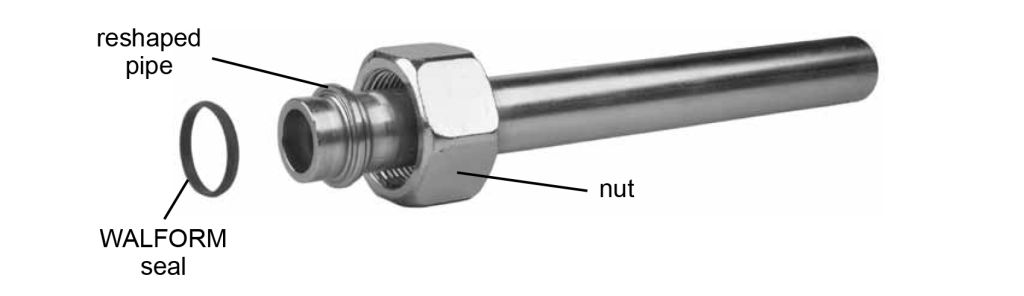 A nut with an elastomer (Viton) seal. For the system to work, the end of the pipe must be reshaped in a special machine intended for this purpose (available at TUBES INTERNATIONAL®). A shoulder formed on the pipe with the machine and the elastomer seal do not require any additional elements such as rings to make tight connection. Reliable sealing is obtained when an elastomer seal is pressed between the shoulder on the pipe and 24° cone in a nut body during tightening. The elements of WALFORMplus system (a seal and a nut) are available only as a set marked with a code HDW-MWF…