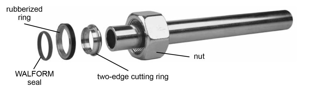 A nut with a two-edge cutting ring integrated with a hardened, rubberized support ring with a special, elastomer (Viton) WALFORMplus seal. The support ring guarantees that the cutting ring properly penetrates a pipe. Reliable sealing is obtained when an elastomer seal is pressed between the pipe and the ring against 24° cone in a nut body during tightening. A complete WalRing system with rings, a seal and a nut is available only as a set marked with a code HDW-MWR…