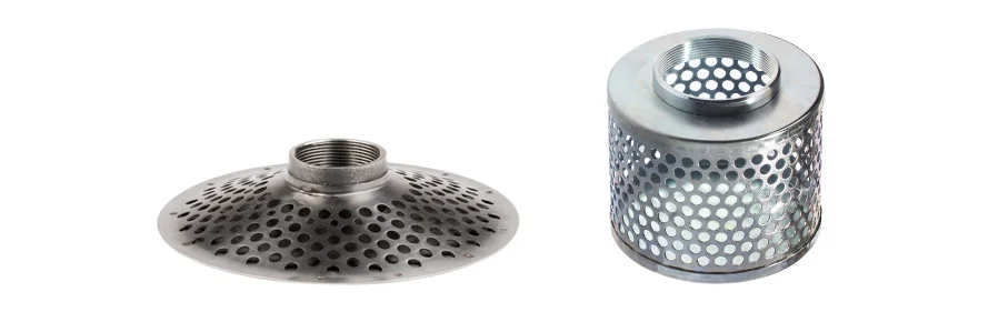 Suction strainer is a suction filter (rose box strainer) mounted at the end of a suction hose. Suction strainers prevent dirt from entering the hose and the system, protecting suction pumps from damage. Used with hoses for drawing water, sludge, sewage, emptying septic tanks or other tanks. Formed into different shapes (cylindrical, conical) and versions (with round or rectangular holes), made of zinc-plated steel sheet, AISI 304 or AISI 316 stainless steel. Connections with BSP or NPT female thread or with a fitting to attach directly to the hose. Sizes from 1.1/2″ (DN40 mm) up to 8″ (DN200 mm).